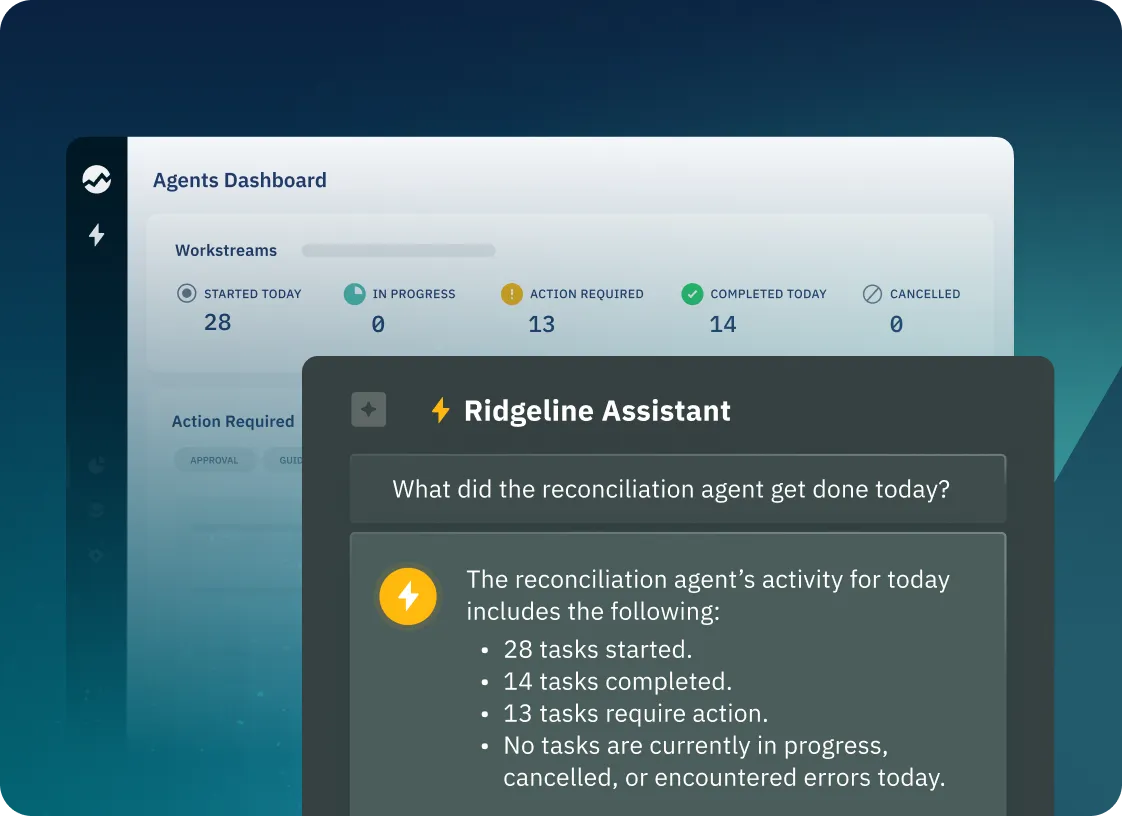 Ridgeline's Reconciliation Agent can automatically process daily reconciliation by comparing records across sources, flagging breaks with clear explanations, and guiding resolution workflows—so your team starts each day with confidence and just a few clicks, not hours of studying spreadsheets.