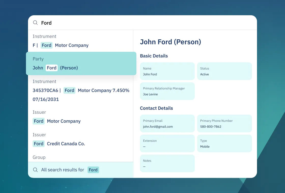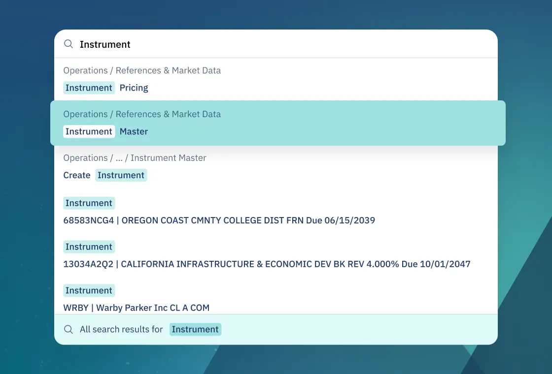 Find portfolios, people, instruments, activities, and more from a single search bar that understands your firm’s data and surfaces the most relevant results as you type.